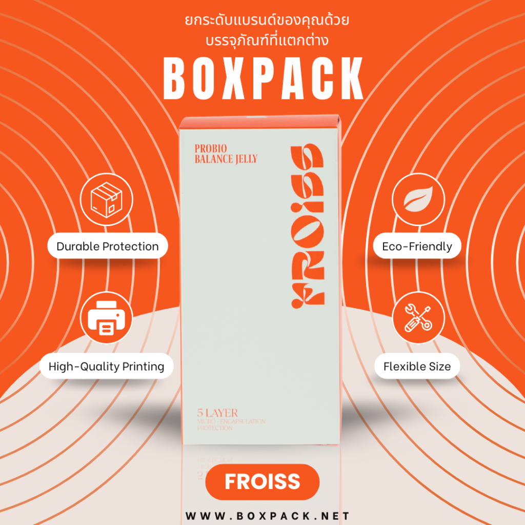 ยกระดับแบรนด์ของคุณด้วยบรรจุภัณฑ์ที่แตกต่าง PROBIO BALANCE JELLY ” FROISS ” มาในรูปแบบด้านในกล่องกลมสีส้มสดใส ด้านนอกกล่องพับอีก 1 ชั้น เพื่อความสวยงามและความแข็งแรงของบรรจุภัณฑ์
